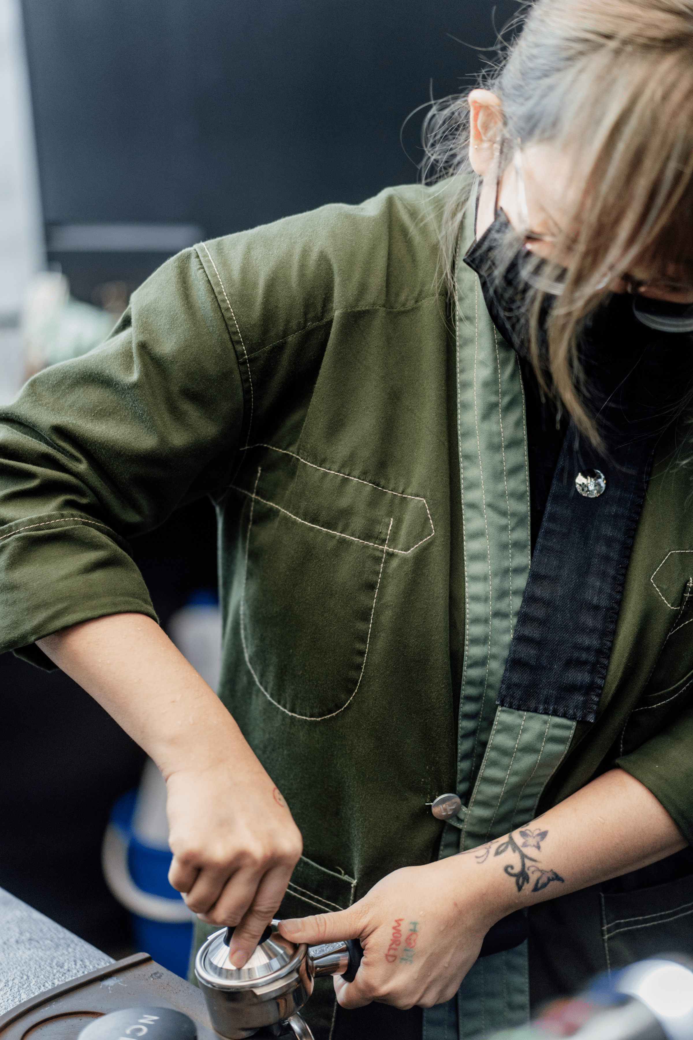 We manufactured a Noragi style uniform for Waga Waga Den, a Japanese inspired coffee bar @ South Beach. The Noragi was crafted using various olive colored cotton twill fabrics & has intricate contrasting stitches throughout.