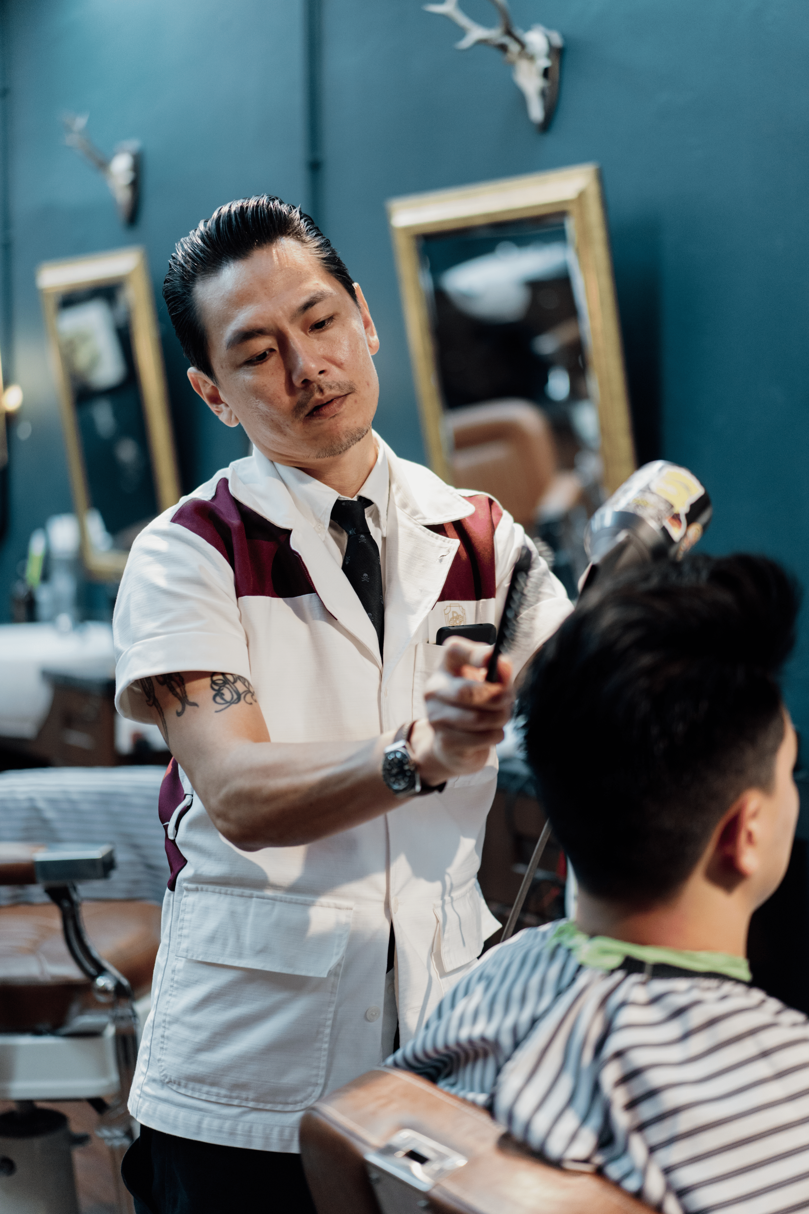 We worked alongside designers Youths in Balaclava to manufacture a barber coat for a charming old-school barbershop, Hounds of the Baskervilles. The barber coat is crafted from cotton cordura twill & features contrasting maroon cotton twill patches.